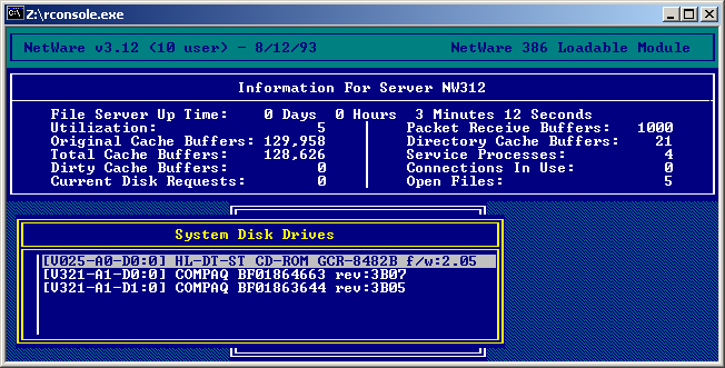 NetWare 3.12 on a HP ProLiant ML370, 2.8GHz XEON, 2GB RAM, 2*18.2GB SCSI harddisks on a HP Ultra3 (Adaptec 29160) controller.